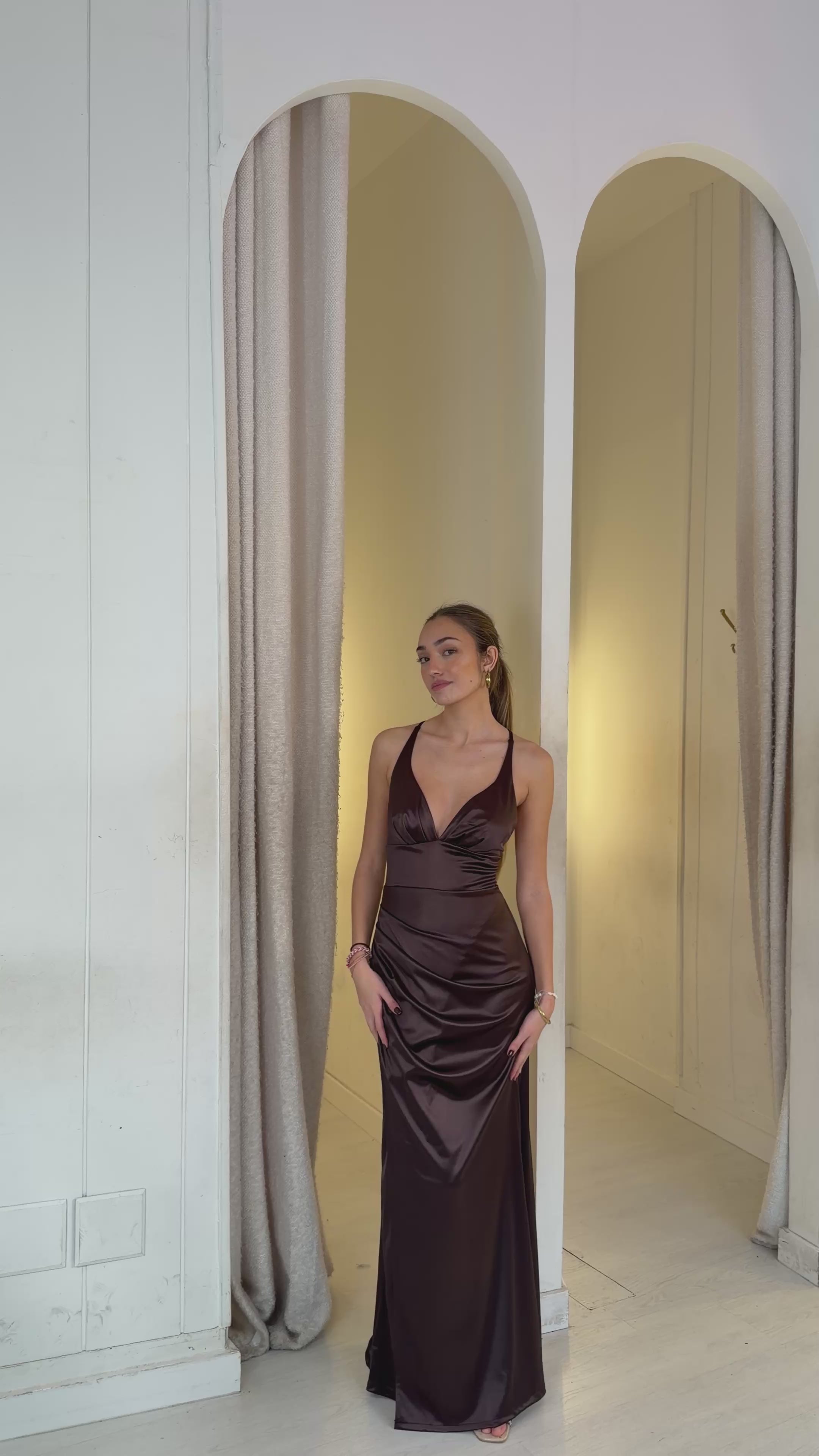 Vestido satinado espalda zigzag. Ideal para graduaciones, bodas y eventos.